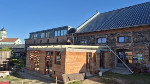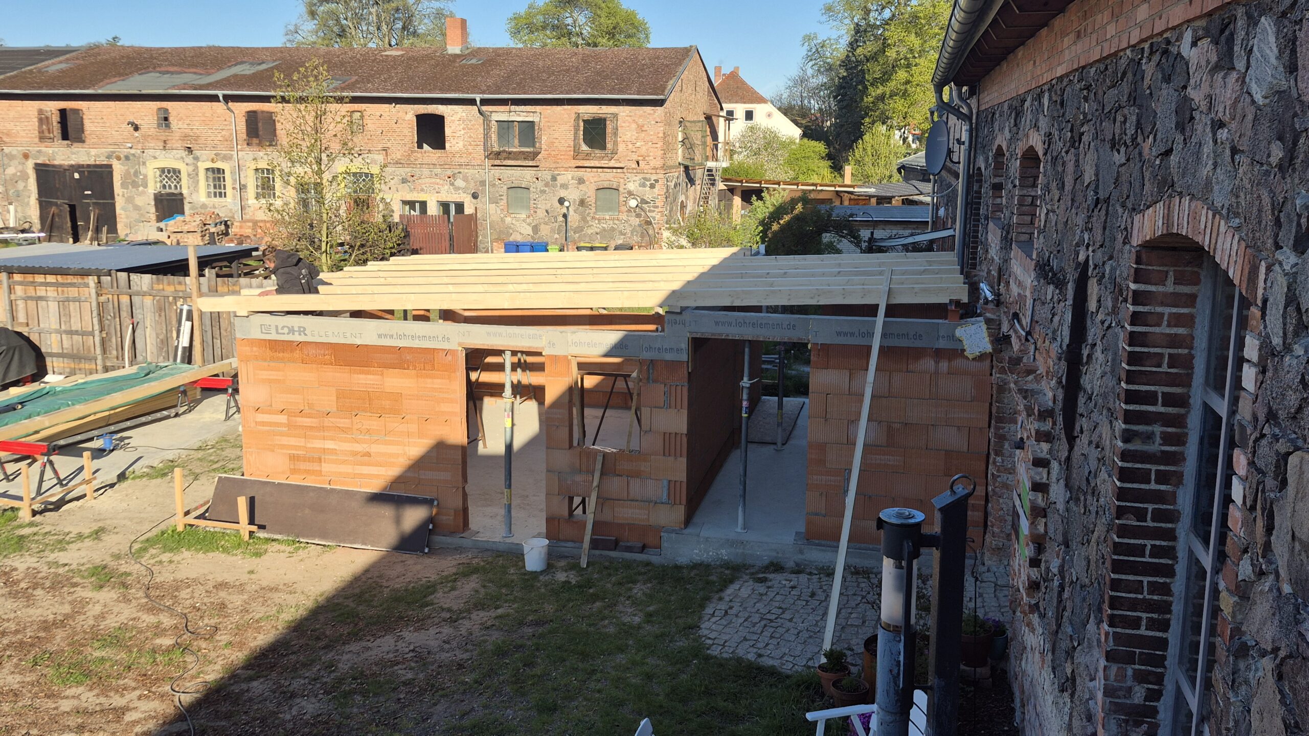 Flachdach richten am Anbau eines Sozialgebäudes mit einer Dachschalung und Trapezblechdacheindeckung.